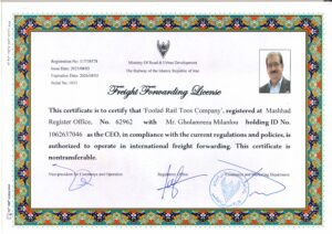 اخذ پروانه فعالیت فورواردری حمل و نقل بین المللی ریلی شرکت فولاد ریل توس
